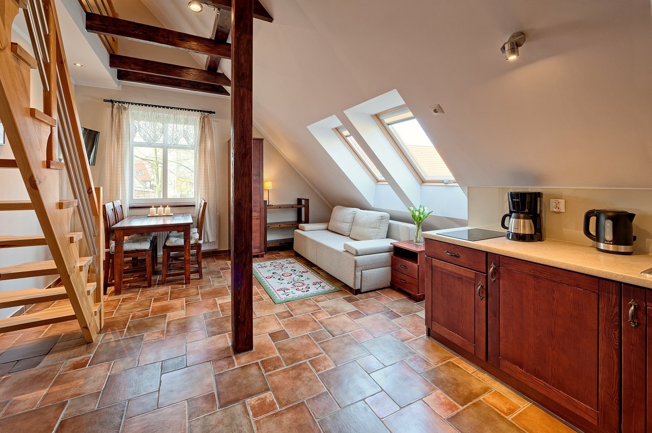 Jest to apartament 4-osobowy rodzinny, dwukondygnacyjny, umiejscowiony na piętrze.
